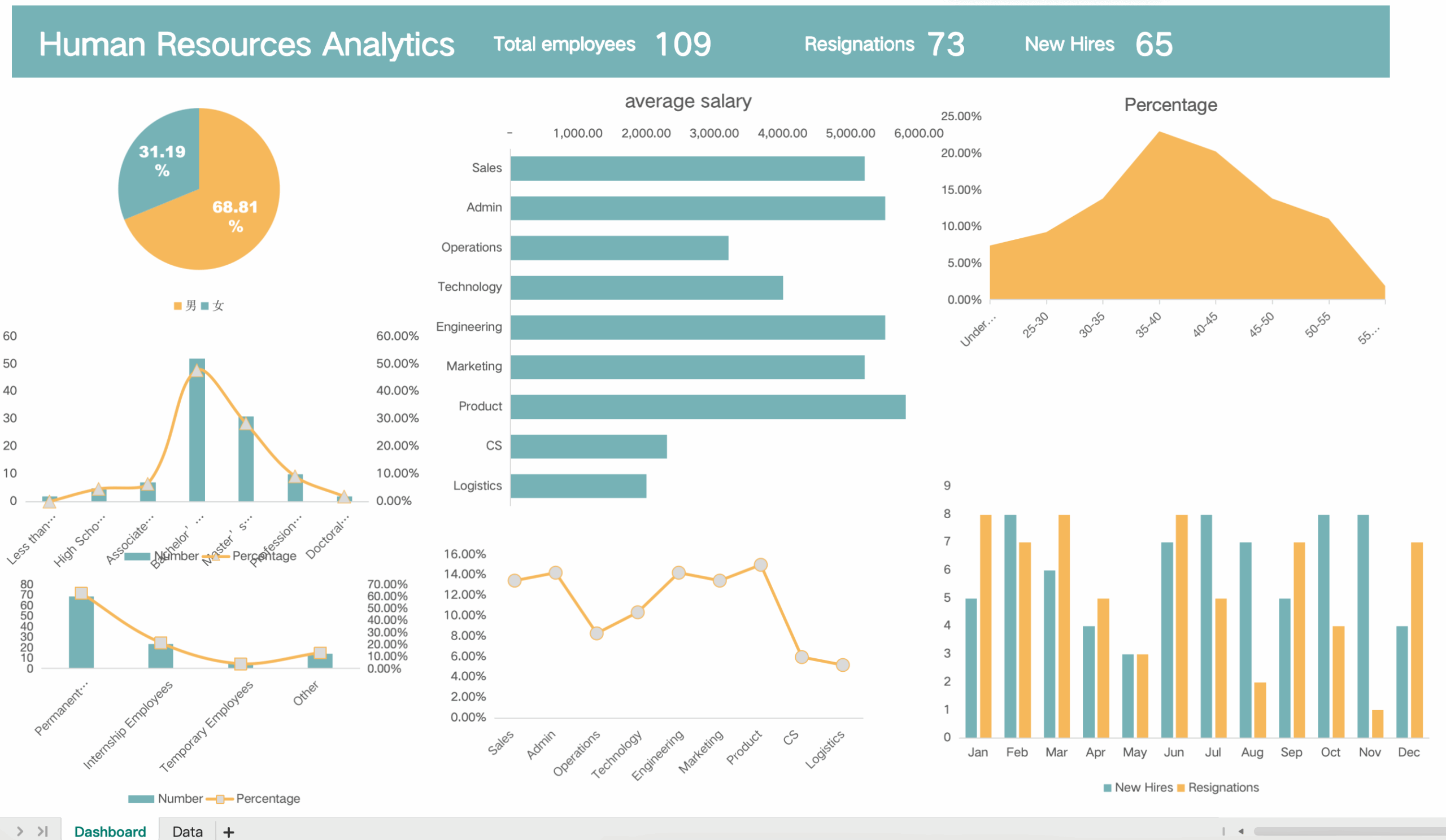 A powerful and visually rich Excel dashboard designed for comprehensive human resources data analysis, including workforce composition, recruitment and resignation trends, average salaries, education levels, contract types, and gender distribution. Perfect for HR professionals and business managers to make data-driven workforce decisions.