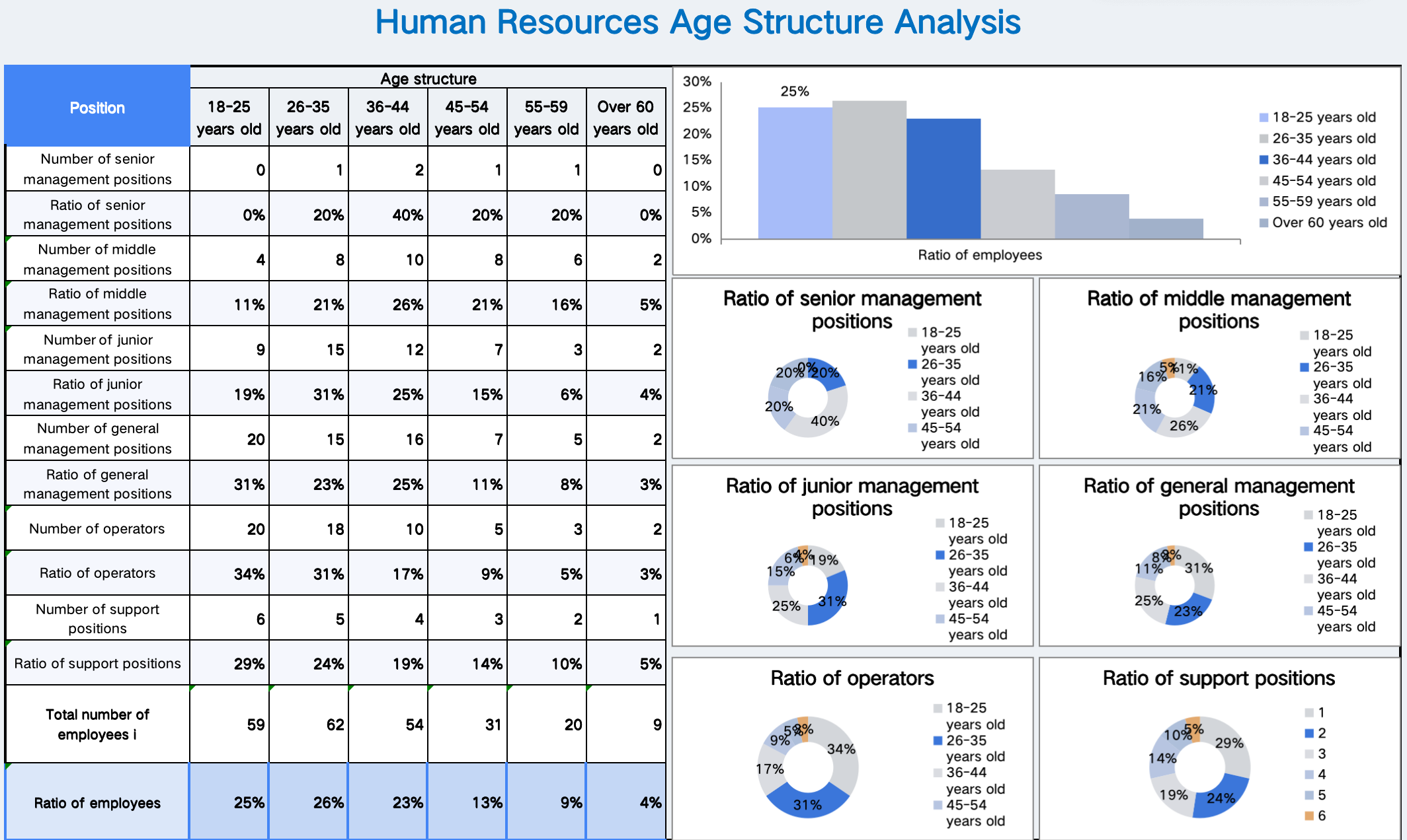 • Comprehensive Age Breakdown – View the number and ratio of employees by age group (18–25, 26–35, 36–44, 45–54, 55–59, 60+ years).