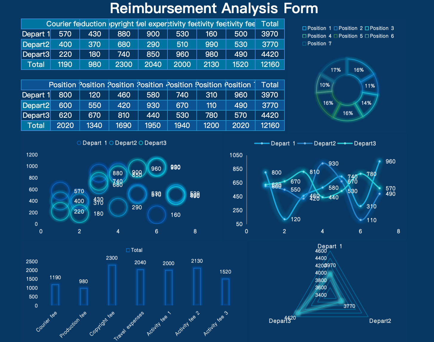 This dashboard organizes expense data by department and position, and provides multiple visualizations — including donut charts, bubble charts, line graphs, bar charts, and radar charts — to help identify spending patterns, cost distribution, and high-expense categories.
